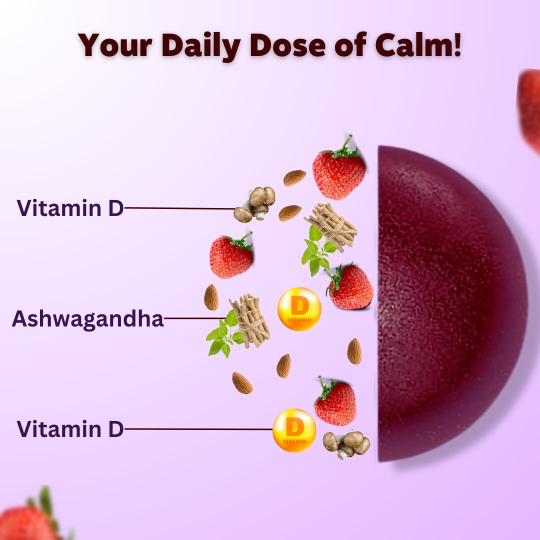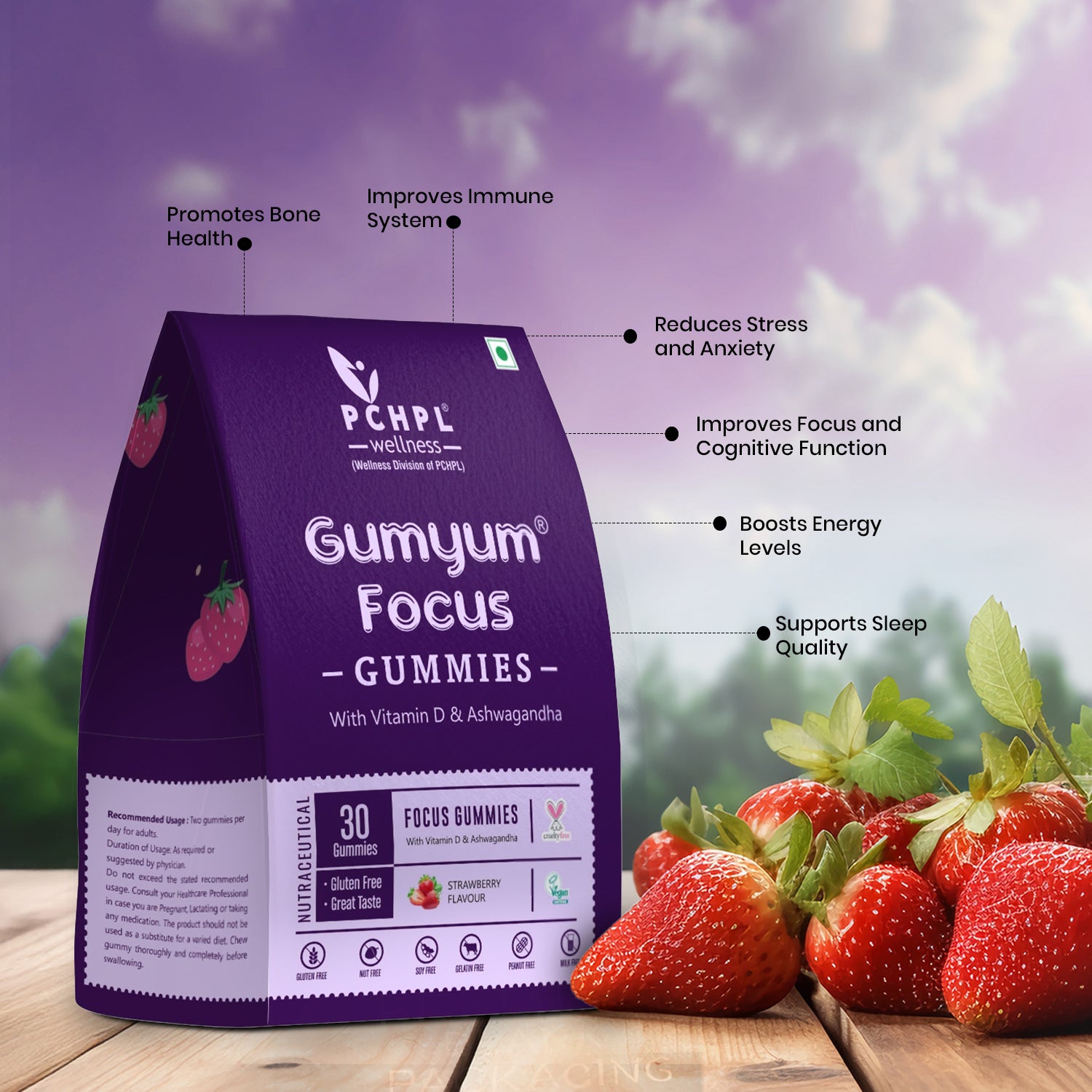 Gumyum Focus Gummies combines the adaptogenic properties of Ashwagandha and the essential health benefits of Vitamin D to naturally enhance mental clarity and overall well-being. Ashwagandha helps reduce cortisol levels, alleviating stress and promoting relaxation, which improves focus and cognitive function. Vitamin D supports brain health, boosts mood by aiding serotonin production, and strengthens the immune system for sustained energy and vitality. Together, these powerful ingredients optimize mental performance, improve memory, and support a balanced, healthy lifestyle. These gummies are perfect for individuals seeking a natural, effective way to reduce stress, enhance focus, and support overall wellness.
