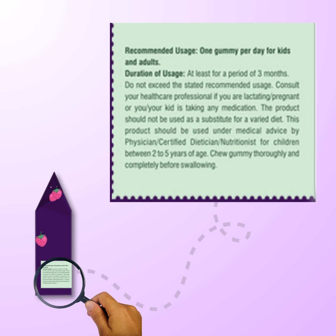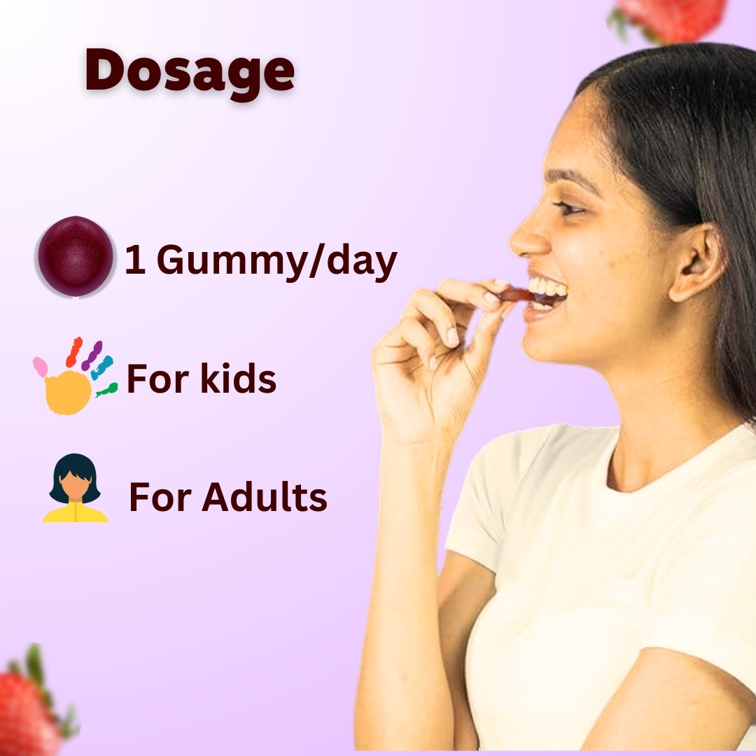 1 Gummies per day for kids & adults or as directed by a healthcare professional.