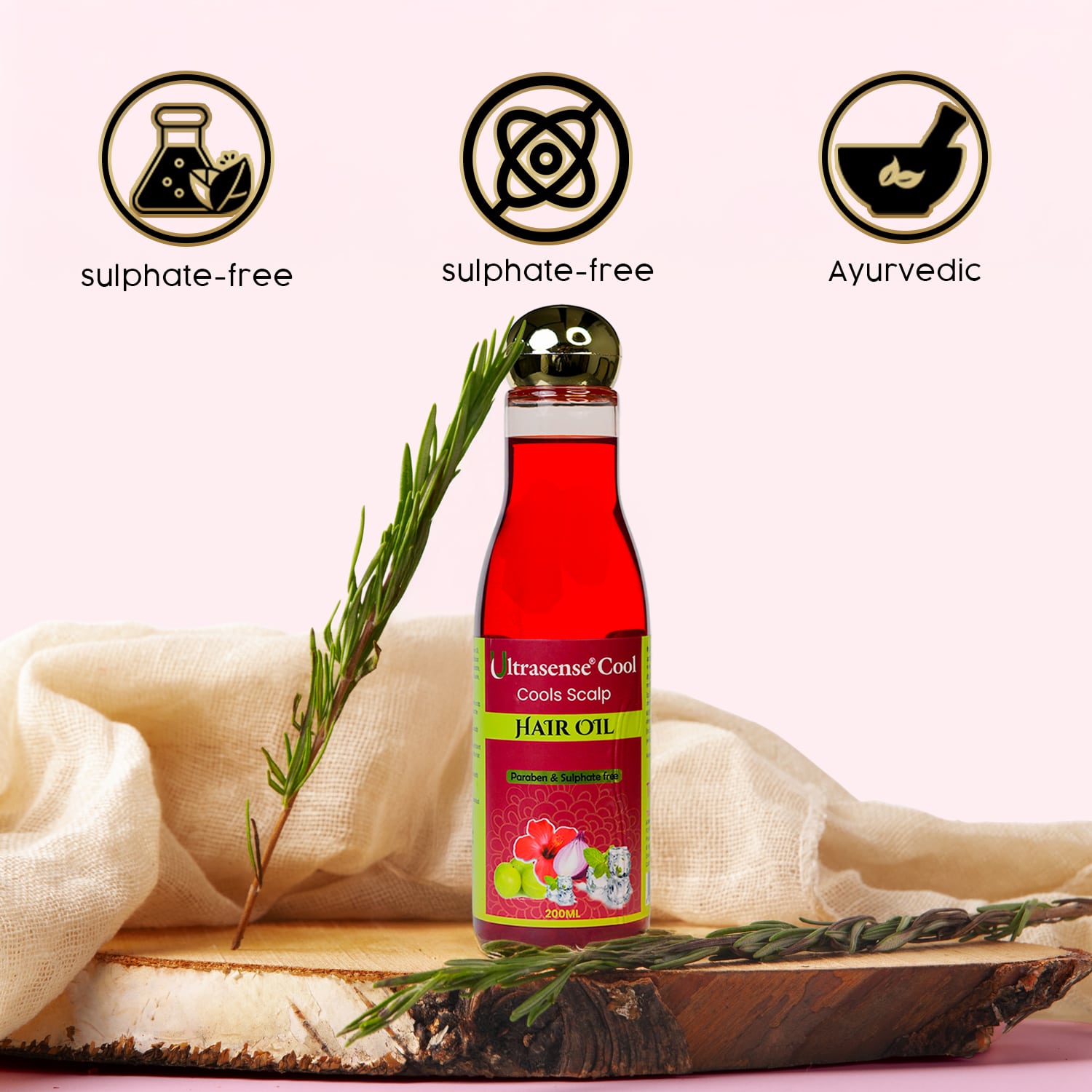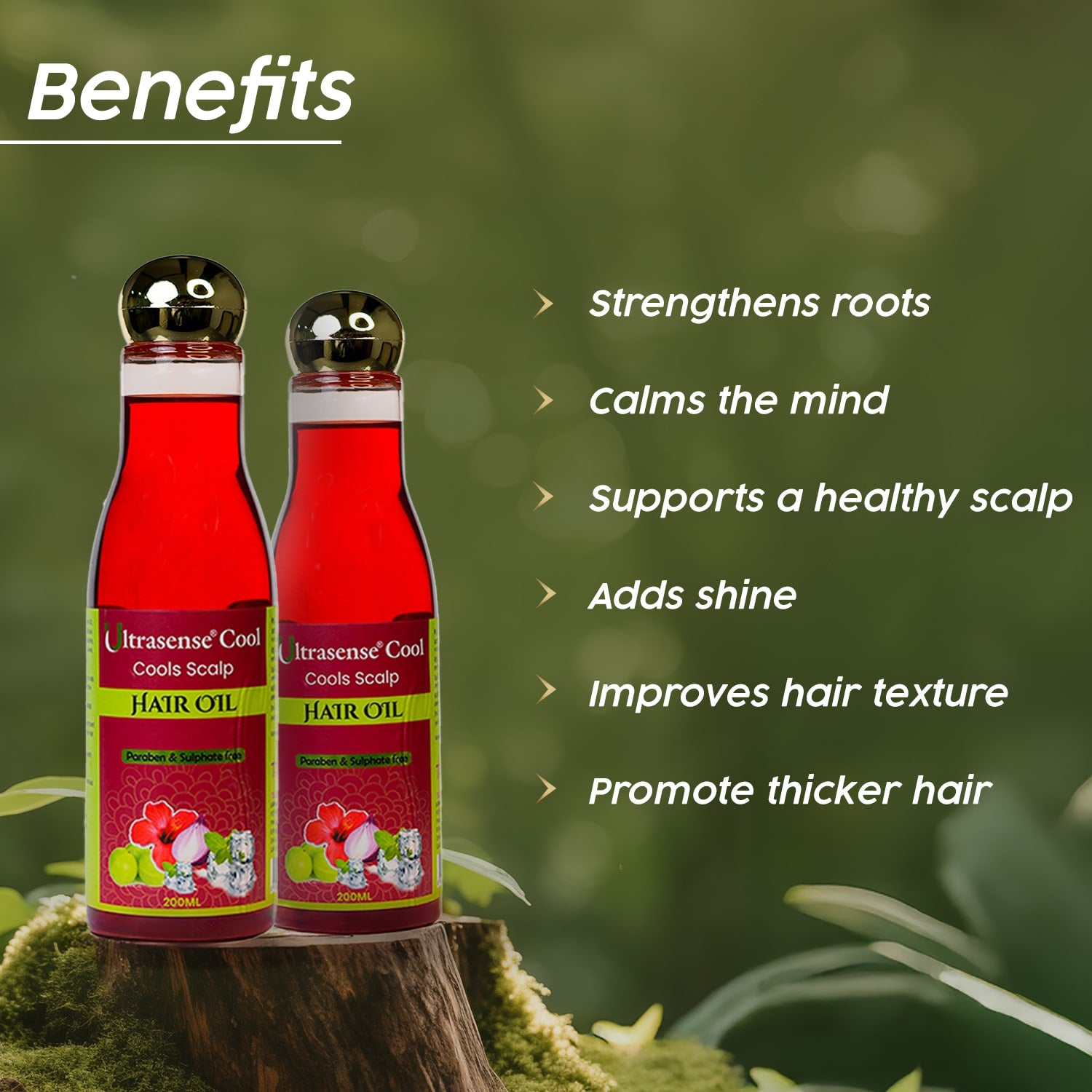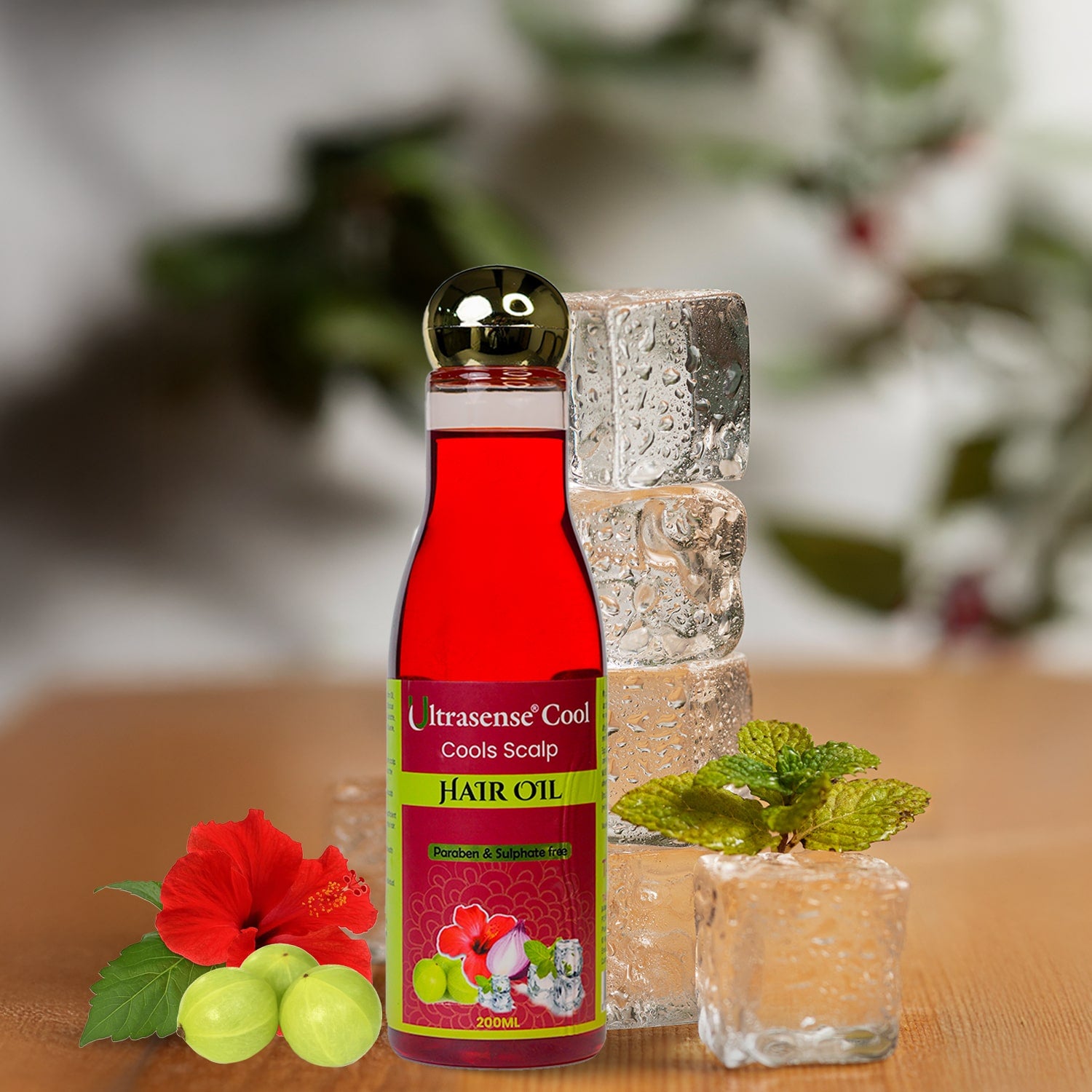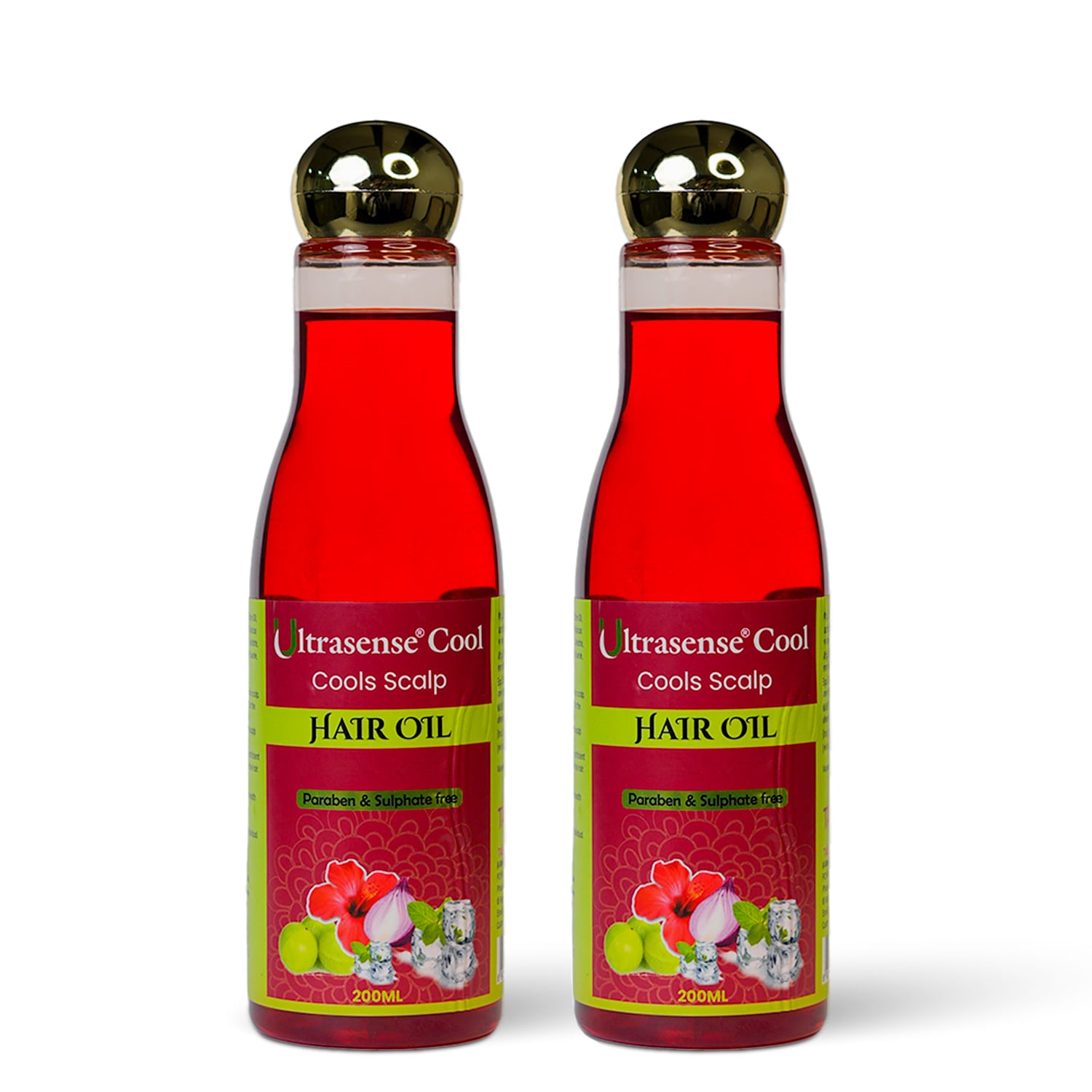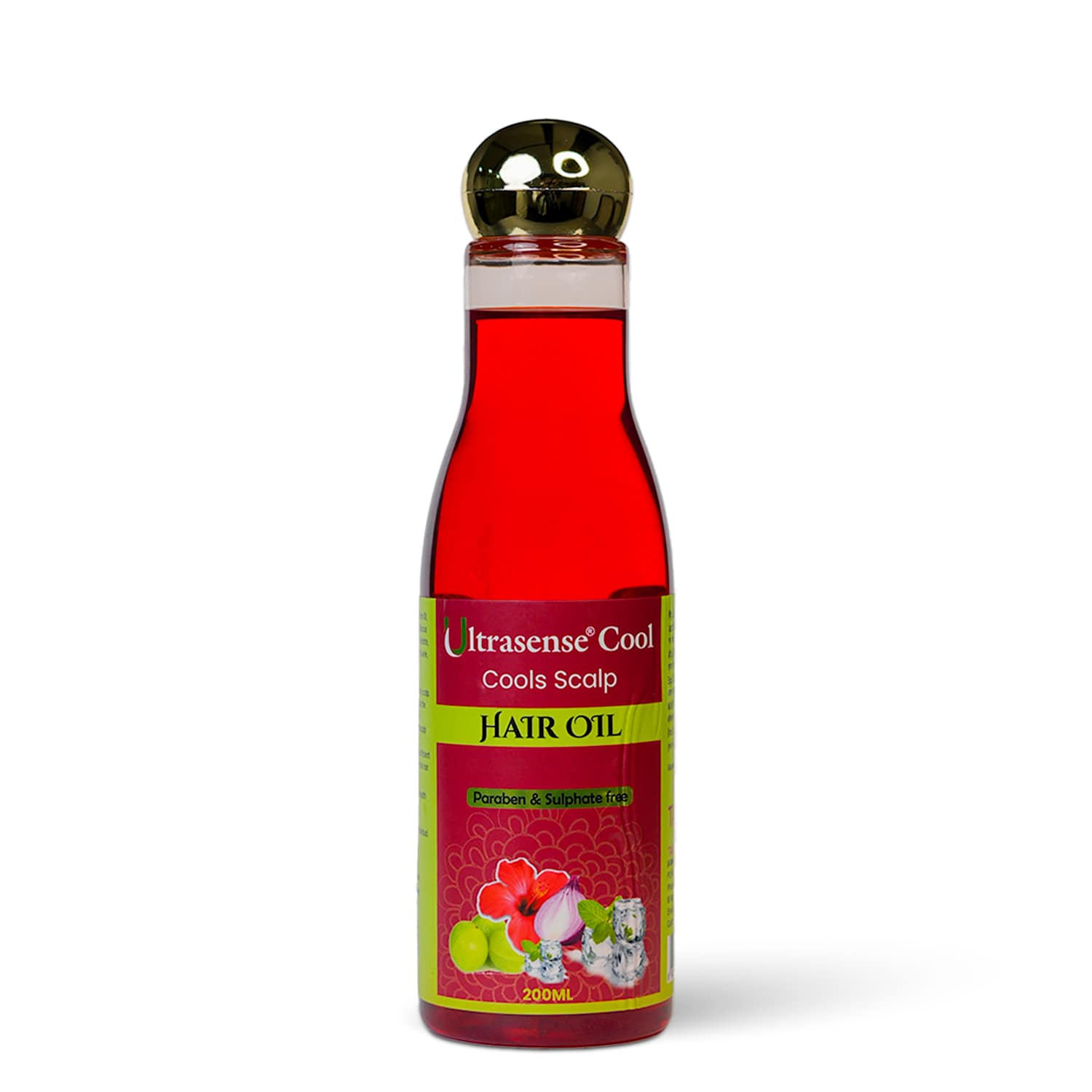 Ultrasense Cool Hair Oil promotes healthy hair growth and scalp rejuvenation. Onion and Bhringraj stimulate hair follicles and reduce hair fall, while Amla and Hibiscus Oil strengthen roots and enhance shine. Brahmi and Menthol Crystals provide a soothing, cooling effect, reducing scalp irritation and stress. Camphor improves blood circulation to the scalp, ensuring better nutrient absorption. This powerful formula combats dandruff prevents premature graying, and leaves hair soft, smooth, and nourished, making it an ideal solution for complete hair care.